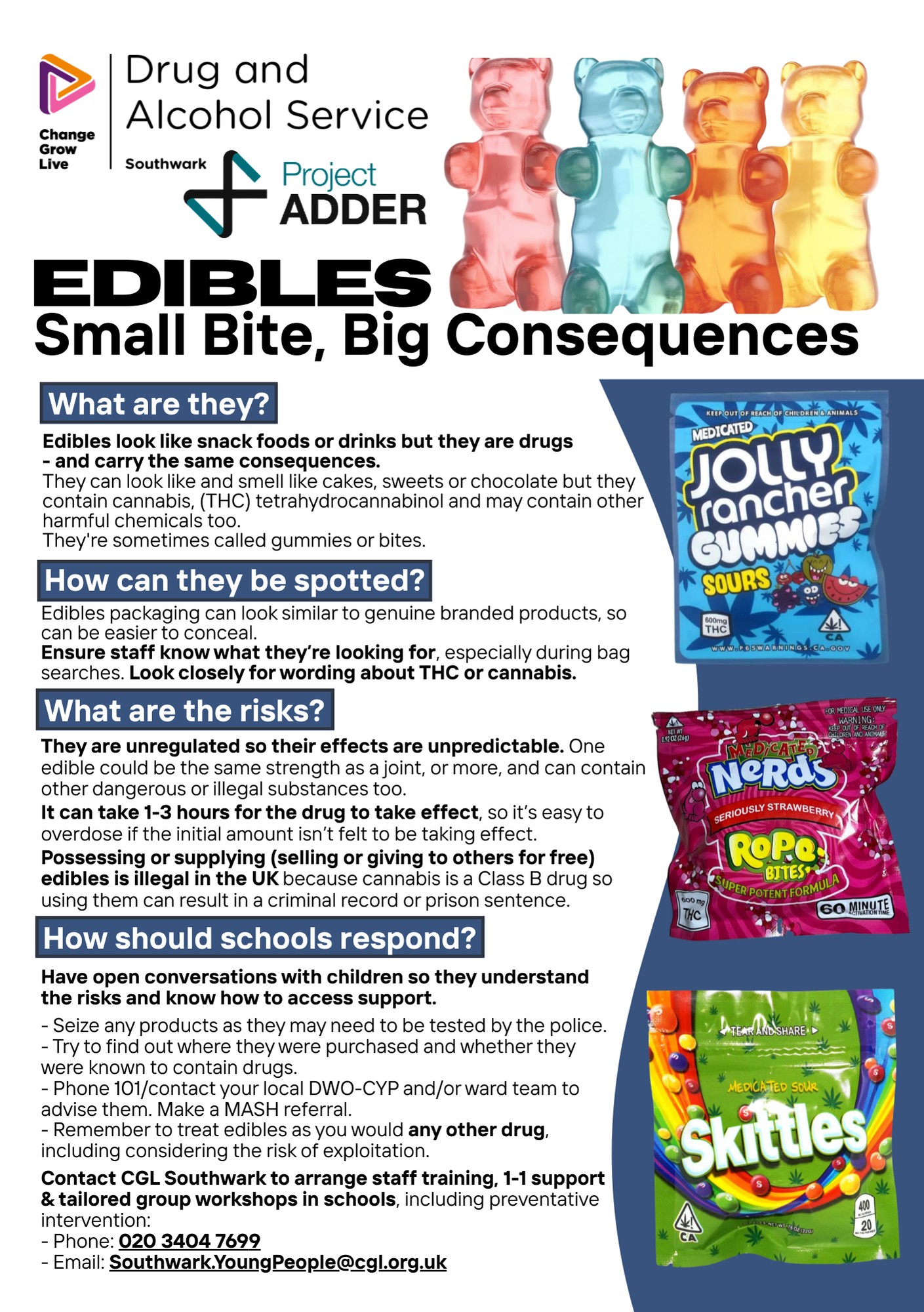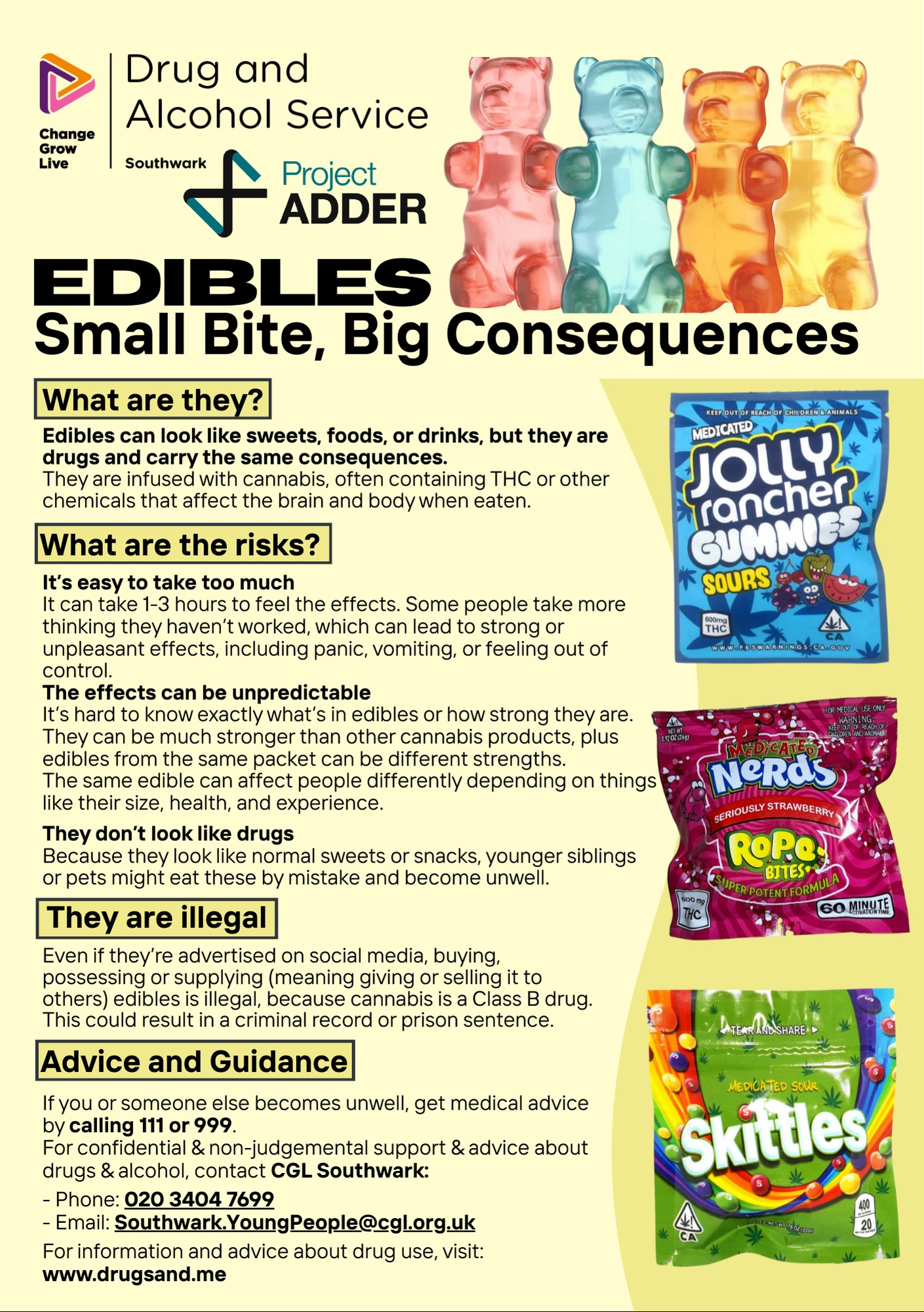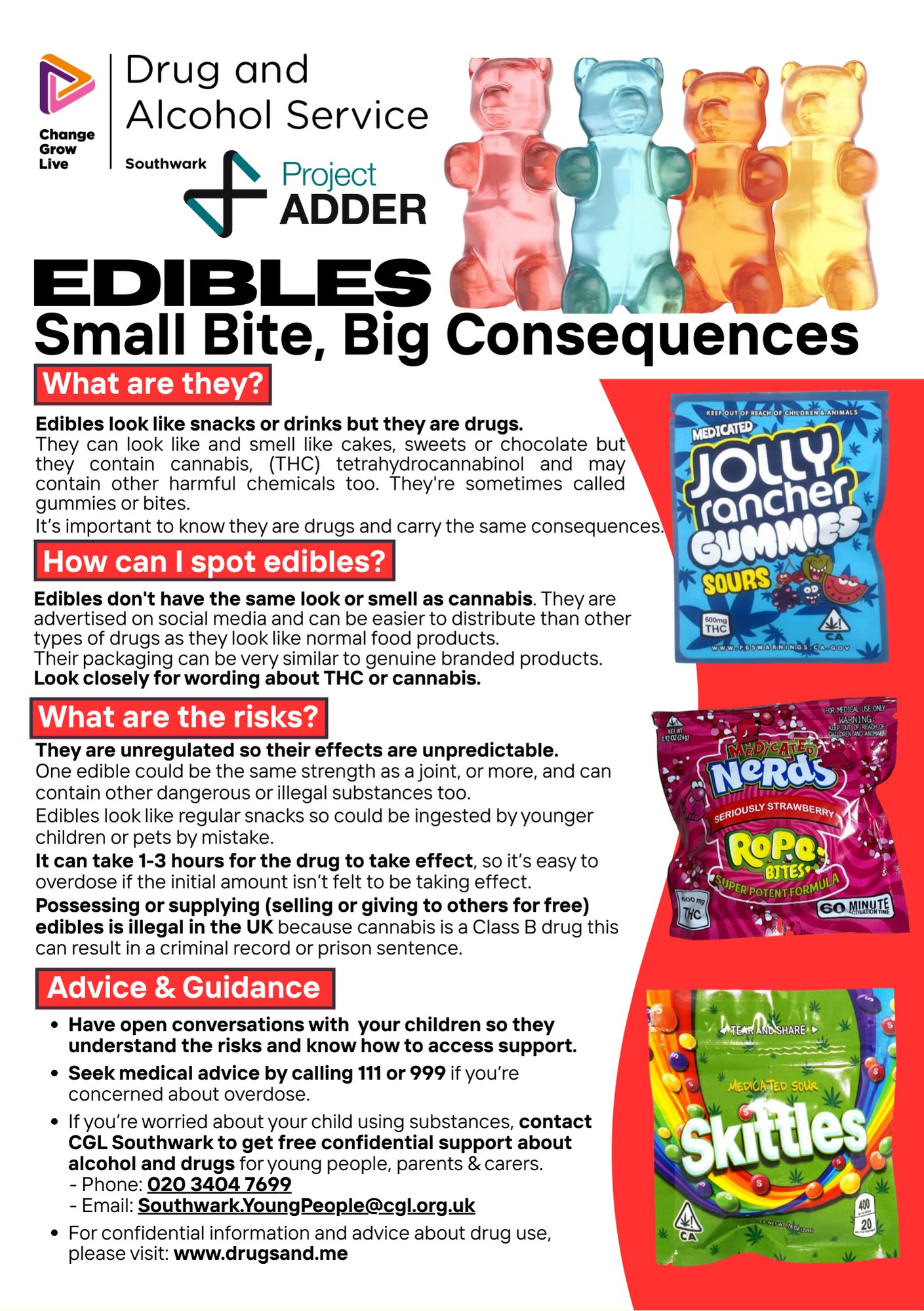 There is a joint campaign led by Southwark Children’s Services, the Metropolitan Police and Change Grow Live (CGL) in response to concerns around young people’s access to, and use of, cannabis edibles. The use of cannabis edibles poses significant risk due to their unpredictable potency, delayed onset of effects, and resulting risk of overdose. Edible products and packaging often resemble genuine, branded sweets and snacks, making them both appealing to young people and difficult to spot. Through the joint campaign, we want to ensure schools and the wider community are able to take actions to safeguard young people against the risk of this form of drug use. The following flyers are available: